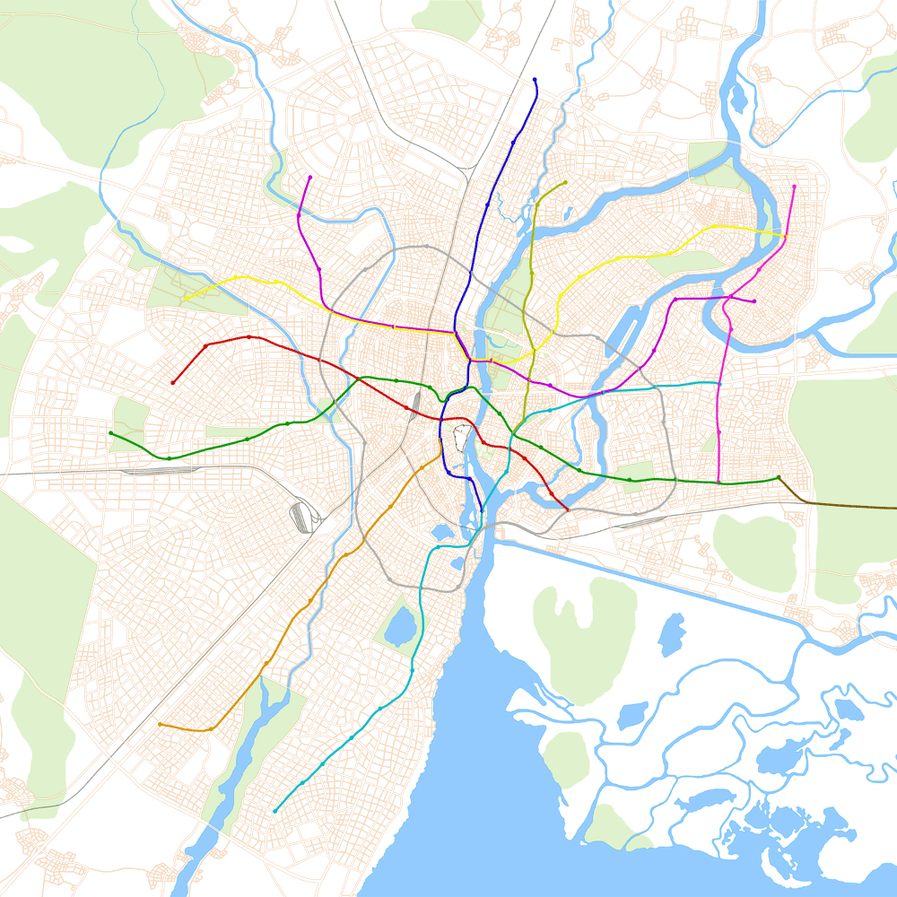The system has 10 primary lines and 101 stations. Each line is designated by a unique name, color, and (Cyrillic) numeral. Most of the lines are arranged as "spokes" linking the city center to the suburbs, with the exception of the silver Kołcévaia Line, which loops around the city and connects the "spokes", and and the rose Viśerineskáia Line, which operates in the eastern part of the city.